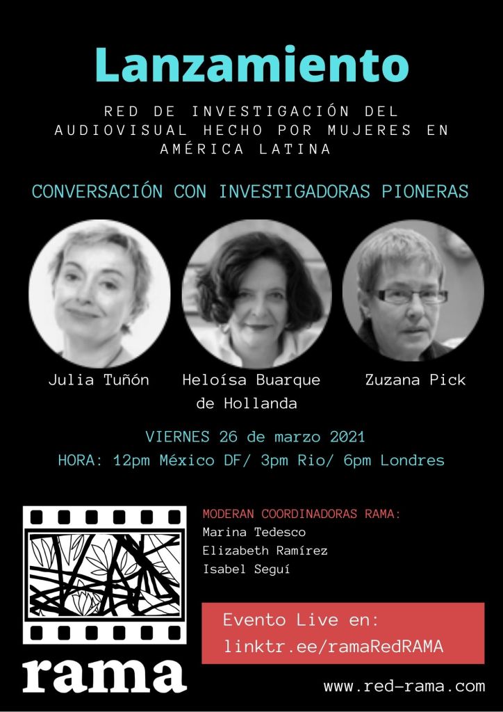 Celebramos el lanzamiento de RAMA, la Red de investigación del Audiovisual hecho por Mujeres en América Latina, con una conversación entre las investigadoras pioneras Julia Tuñón, Heloísa Buarque de Hollanda y Zuzana Pick, moderada por las coordinadoras de la Red. El viernes 26 de marzo 2021 a las 12 pm México/ 3 pm Rio de Janeiro/6 pm Londres.